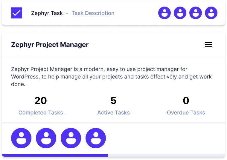 Zephyr Project Manager is a modern project manager for WordPress that helps you keep your projects on track and helps you to actually get work done.